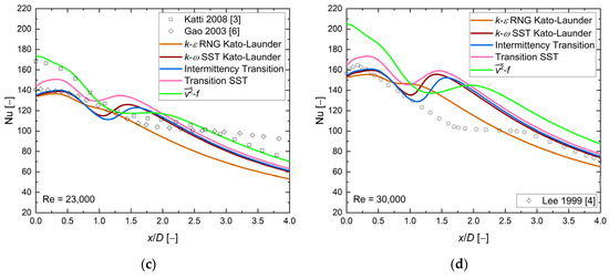 The local Nusselt number distribution, comparison between CFD RANS results and experimental data [1,2,3]. H/D = 1, D = 0.02, and (a) Re = 10,000, (b) Re = 20,000, (c) Re = 23,000, (d) Re = 30,000.