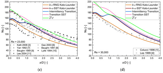 The local Nusselt number distribution, comparison between CFD RANS results and experimental data [1,3,4,6,7,8,9,10,11]. H/D = 6, D = 0.02, and (a) Re = 10,000, (b) Re = 20,000, (c) Re = 23,000, (d) Re = 30,000.