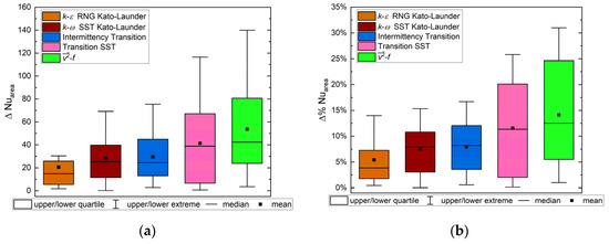 The output of this study was a matrix—for each Reynolds number and H/D ratio, the relative and absolute differences for each turbulent model were obtained. To streamline the analysis, statistical data for each turbulence model were computed across the entire spectrum of the Reynolds numbers and H/D ratios. Figure 14 presents the box and whisker plot, which summarizes this investigation.