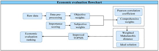 Other contents are organized as follows: The economic evaluation system of power transmission systems is constructed in Section 2, focusing on three aspects and determining the specific evaluation criteria. In Section 3, the subjective weights and objective weights are calculated, then an integrated weighting model is established by applying the game theory. Section 4 outlines the deficiencies of the traditional TOPSIS method and introduces the improved TOPSIS method utilizing the Mahalanobis distance and Pearson coefficient. In Section 5, the comparison analysis is carried out on the specific data of 500 kV transmission and transformation projects to acquire the evaluation results for the proposed criterion system, model, and improved method.