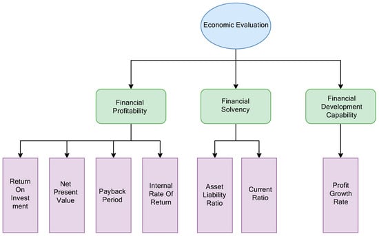 According to the characteristics of the power transmission system and the theory of financial evaluation criteria, this paper establishes the evaluation system from three perspectives: financial profitability, financial solvency, and financial development capability []. The evaluation of comprehensive economic efficiency is carried out mainly from the perspectives of time, value, and efficiency [,], and these three perspectives are substantially equivalent, which means that many of the criteria are consistent at their core.