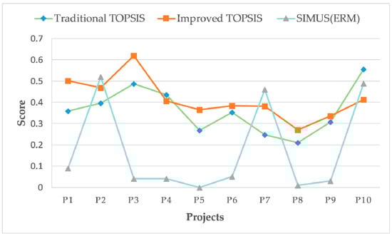 All four sets of scores (traditional and improved relative closeness, NET, and Final Result) were obtained by three different methods or perspectives to rank the example projects, as shown in Table 13. The rankings obtained by the ERM and the DPM are identical. A comparison of the results of the three methods is shown in Figure 8.
