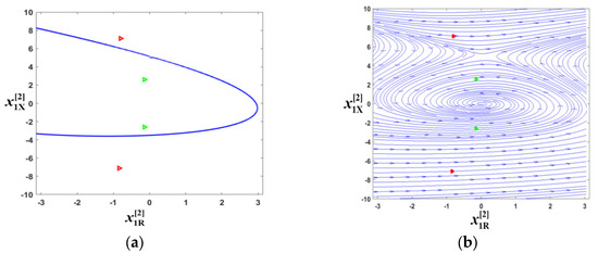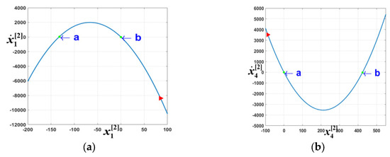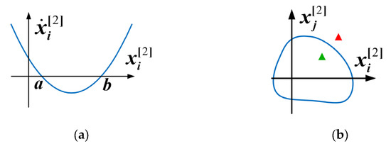 For the decoupled first-order quadratic modes in (6), the ROA can be calculated by the corresponding diagram. As shown in the diagrammatic sketch in Figure 1a, the curve intersects the abscissa axis at points a and b. When , will gradually destabilize by moving toward point a. When , also gradually moves toward point a. When , moves toward the right axis and loses stability. Upon synthesizing the derivative signs of the above three intervals, the ROA of the state variable is which means that when the initial point is in this interval, the state variable returns to the stable operating point.