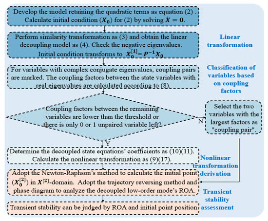In summary, the proposed CFND method calculates the coupling factors to evaluate the coupling degree between different variables and decouples the original high-order nonlinear system into multiple low-order quadratic modes. Thus, mature methods can be adopted to analyze the low-order modes, and the transient stability of the initial system can be reflected indirectly. The complete flow chart of the CFND method is summarized in Figure 2.
