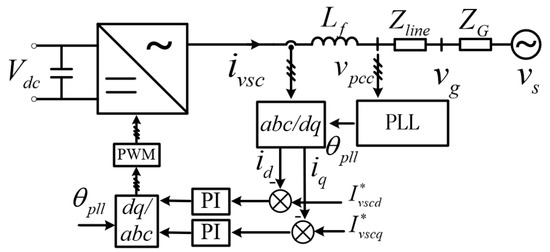 Figure 3 represents the simplified diagram and the adopted control method for each VSC. For VSC in grid-following mode, there is usually a large capacitor or a control part adopted to stabilize the DC voltage, so the DC side can be considered an ideal voltage source, the voltage of which can be represented as On the AC side, the VSC is filtered by the inductor (). After that, the VSC is connected to the weak grid by line impedance (). The weak grid consists of the ideal voltage source () and grid impedance (). The amplitude and phase of the grid voltage can be represented as and , respectively. In terms of the control strategy, the VSC measures the three-phase current () and the point of common coupling (PCC) voltage () to the PLL to obtain a phase . Through Park transformation, can be transferred to the active current () and the reactive current (). The active current reference is , and the reactive current reference is . The current is regulated by the PI controller to achieve zero-steady-state error.