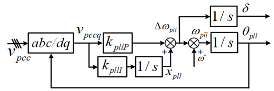The control principle of PLL is to achieve phase lock using a PI controller to make the projection value of the q-axis PCC voltage zero. The q-axis voltage can be derived as follows:
