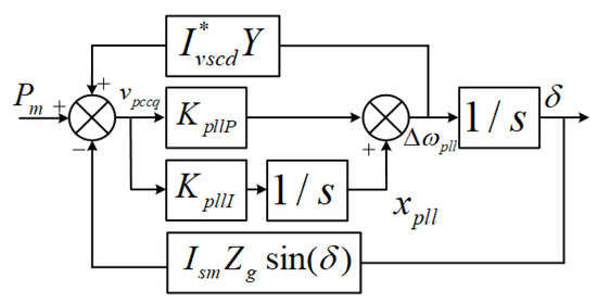 The control principle of the PLL in each VSC involves using a PI controller to make the q-axis voltage zero, ultimately determining the phase at PCC. Therefore, the q-axis voltage at each PCC can be expressed as