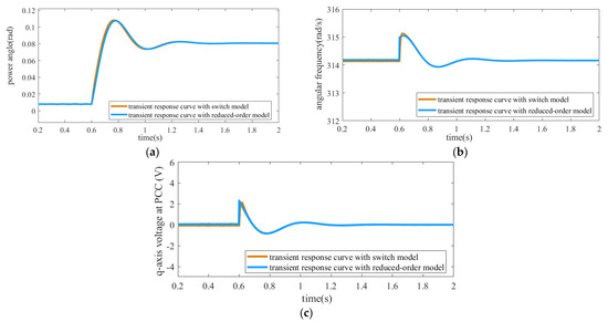 To verify the effectiveness of the reduced-order model for the single VSC grid-connected system, in the case when grid voltage drops suddenly from 311 V to 31.1 V, the model can be verified by comparing response curves of the power angle, system frequency, and q-axis voltage (), adopting the accurate switch tube model and the reduced-order model through simulation. Simulation comparison diagrams are shown in Figure 6.