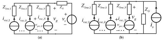 where represents the power angle of the k-th VSC. According to (42), the PCC voltage of the k-th VSC is influenced not only by its own loop’s current reference value as well as the grid current and grid impedance but also by the current and impedance on other VSC lines. It is illustrated that coupling of the frequency and phase between multiple VSCs occurs and that the complexity of the whole system is dramatically improved.