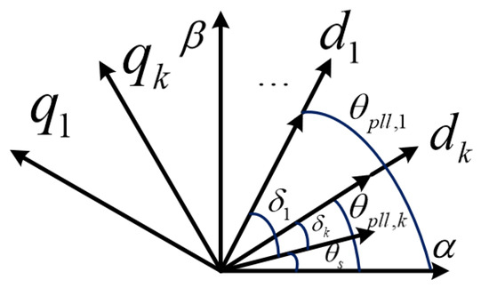 Each VSC’s PLL is regulated by locally measuring voltage information. As a result of different line impedances, the active and reactive current reference values for VSCs and angles detected by VSCs are different. Figure 9 displays the phase angle diagram for the grid-connected system with multiple VSCs.