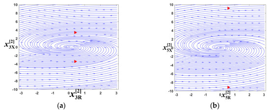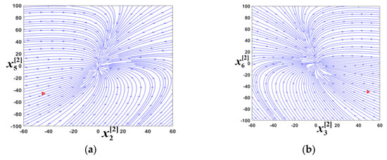 Furthermore, the phase diagrams of the coupling pairs and , and , as well as the corresponding initial points, are shown in Figure 12. The phase diagrams illustrate that these two pairs of state variables are globally stable.