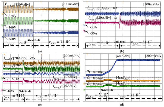 Experimental results of VSCs when the voltage drops from 311 V to 31.1 V. (a) Grid voltage waveforms. (b) Active and reactive power waveforms of VSC1. (c) Active and reactive power waveforms of VSC2 and VSC3. (d) Phase angle of VSC1,2,3.