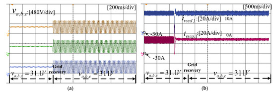 When the grid voltage is restored from 31.1 V to 311 V, the output currents of different VSCs and the phase angles are shown in Figure 17.