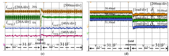 Experimental results of VSCs when voltage recovers from 31.1 V to 311 V. (a) Grid voltage waveforms. (b) Active and reactive power waveforms of VSC1. (c) Active and reactive power waveforms of VSC2 and VSC3. (d) Phase angle of VSC1,2,3.