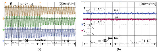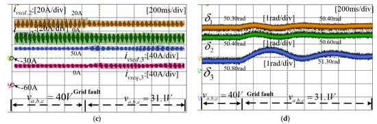 Similarly, when the grid voltage sags from 40 V to 31.1 V, the corresponding output current and phase angles are as shown in Figure 18, and the system can still maintain transient stability. During the drop in the voltage amplitude, the output current values remain equal to the reference values. Since the voltage amplitude does not change much, the transient performance of the output current change is relatively smooth. The tracking angles of VSC1 and VSC2 can be stabilized after a small oscillation, and the tracking angle of VSC3 can also be stabilized after a relatively large oscillation. The experimental results are consistent with the theoretical analysis, indicating that the system can maintain transient stability when the initial operating point lies within the stable region.