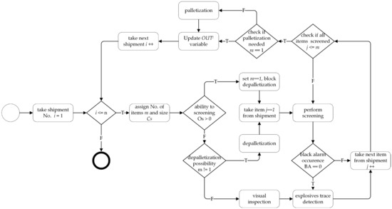 This simulation experiment involves a screening process for all cargo shipments from i = 1 to n. A simplified algorithm of the simulation model in BPMN notation is shown in Figure 3. In the beginning, the number of items m in the shipment and the dimension of shipment Cs = [W H] are drawn. The number of shipments is given by the user of the model on a deterministic basis. Dimensions are given randomly according to the P(w), P(h) and P(l) functions entered by the user. Next, it is checked whether the size of the shipment is adequate for the tunnel size of the X-ray device Xs = [W H]. The dimensions of the tunnel are set deterministically by the user. When the value of the Os (3) formula is greater than 0, this means that none of the dimensions exceeds the allowable value. Only the height and width are checked. The device, through continuous screening, can measure shipments of any length. If the shipment is suitable for screening, the screening is performed. The screening time is given by a probability density function specified as input variable P(txray). If its dimensions do not meet the requirements, then the number of items m in the shipment is checked. Variable m is determined according to a probability distribution P(m). This is an input variable set by the user. When m is equal to 1, ETD (Explosives Trace Detection) and visual inspection should be performed. This is because the shipment is too large and cannot be deconsolidated into smaller items. When m is greater than 1, deconsolidation (depalletizing) can be performed to m items. Then, each item from j = 1 to m is screened by X-ray. After screening, all items from the shipment needs to be consolidated (palletized) again. The depalletization time is given by the probability density function P(tdep). The palletization time is given by the probability density function P(tpn). ETD control time is given by the probability density function P(tetd). Visual inspection time is given by the probability density function P(tvl). These are user-specified input variables.