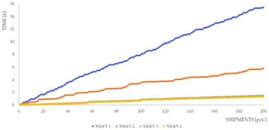 For the data indicated in Section 4, the handling of 200 cargo shipments was simulated separately for different X-ray equipment. One hundred experiments were conducted for each of the four system configurations. In each configuration, a different X-ray device was analyzed. Mean values of the output variables were calculated for each configuration. These values were taken as the output data for the analysis. The function of the time of screening 200 pieces of air shipments as a function of the number of shipments screened is indicated in Figure 4.