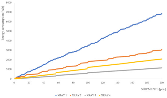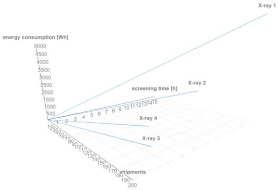 The most favorable choice for the air cargo terminal in this case would be to use the X-ray 3 device, as the inspection time of 200 pieces was short and similar to the X-ray 4 device (less than 2 h). The X-ray 3 device, however, consumed much less power compared with the X-ray 4 device. The X-ray 4 device consumed almost twice as much energy as X-ray 3. Due to the shipment inspection time, X-ray 1 and 2 devices should not be used. It took more than 8 times longer to inspect the same stream of shipments using the X-ray 1 device than the X-ray 3 and 4 devices, and energy consumption was more than 3.5 times higher compared with those devices. One could consider using X-ray 2 as a device to support the screening process, but only for shipments of certain dimensions. It would then be necessary to direct smaller shipments to the X-ray 2 device and larger shipments to the X-ray 3 device (if the screening system could consist of two devices). The correlation between energy consumption and screening completion time from the number of shipments being screened is shown in Figure 7. In the case of guidelines for the screening system, it would be necessary to develop an evaluation model for the screening system for air shipments, which would clearly define the evaluation of such a system.