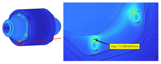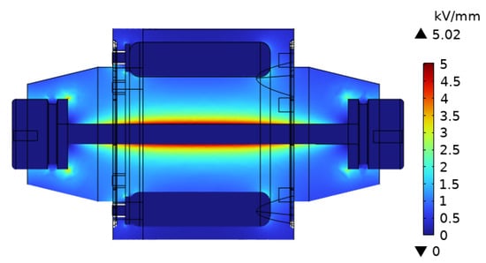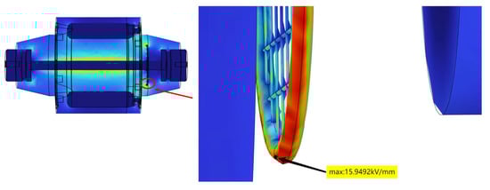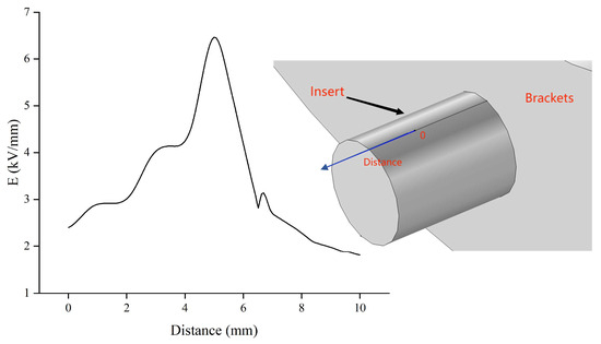 Figure 10 displays a comparison of the electric field on the surface of the insert. The line graph illustrates a smoother distribution of values near the peak, where the maximum value of the electric field distribution on the axial distance is reduced from 6.46 kV/mm to 6.34 kV/mm.
