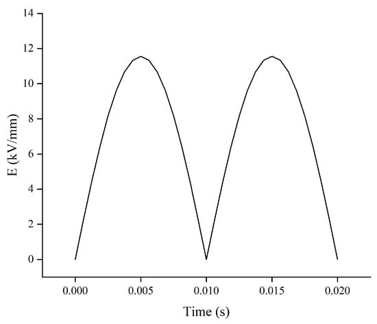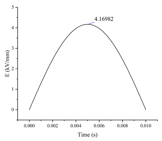 The transformer’s withstand voltage and partial discharge value can be impacted by the maximum electric field strength and its location. The maximum electric field strength and its location in the computational domain is shown in Figure 3. It shows that the maximum electric field strength in the transformer is 11.5561 kV/mm near the air gap. We define that point as , the coordinates of which are x(), y(), z(). A probe is positioned at to analyze the variations of electric field in two cyclicalities. The results in Figure 4 show that the electric field varies uniformly and reaches its maximum at 0.005 s, which corresponds to the peak moment of applied voltage.