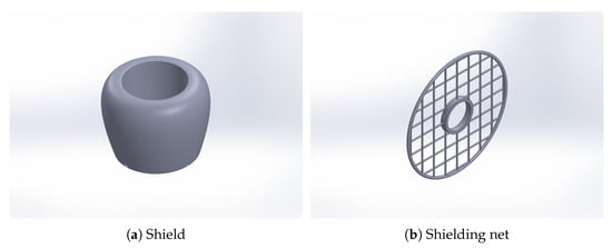 The most common method of balancing the internal electric field distribution of a transformer is using a metal shield or a shielding net shown in Figure 6. A shield is typically employed at the end of capacitive insulation structures in vertical or inverted transformers. The shields are often designed in a columnar shape to balance the electric field exposed in the air and to reduce local discharge signals. A shielding net is often used in cast-resin type CTs, generally installed behind the transformer terminals, to allow the maximum electric field strength appearing on the shielding net to improve the transformer’s ability to withstand voltage. This paper proposes an optimization scheme for the transformer, which involves adding a shielding net with a radius of 42 mm and a wire diameter of 4 mm, positioned 70 mm from the primary terminal. The optimized internal electric field, circled in red, is primarily concentrated on the shielding net shown in Figure 7.