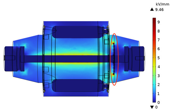 In order to observe the internal electric field distribution of the transformer, we set the longitudinal direction of the transformer to be the X-axis and the radial direction to be the Z-axis. The X-Z plane is selected as the observation plane. Figure 2 presents the cross-sectional view of the X-Z plane of the simulation. The electric field in the cross-sectional view is found to be mainly concentrated near the conductive rod, the surfaces of inserts, and the end of the terminals.