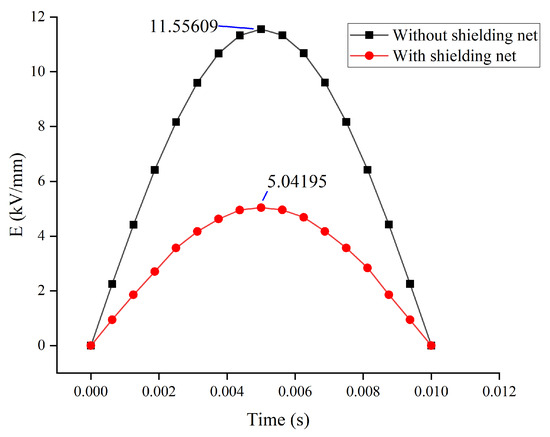 The maximum field strength in the optimized computational domain is on the inner surface of the shielding net with a value of 15.9492 kV/mm. Figure 8 displays the location of the maximum electric field in the computational domain, indicating a shift from the insert to the inner surface of the net, from the exposed part to the internal. Since the breakdown electric field strength of the epoxy resin is greater than 30 kV/mm, the internal electric field strength of the transformer remains within a safe value. Figure 9 shows the variation of electric field at the original maximum point during the simulation after improvement. The electric field strength at that point significantly declines throughout the calculation time, from the value of 11.5561 kV/mm to 5.0419 kV/mm. The improvement results are prominent.