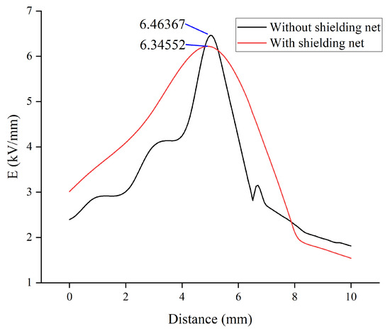 The location of the maximum electric field of the current transformer shifts from the external insert to the internal net surface after the shielding net is added. The electric field strength at decreases from 11.5561 kV/mm to 5.0419 kV/mm, and the distribution near the insert over the axial distance is smoother. The comparison results show that the addition of a shielding mesh to the transformer enacts a certain improvement on the electric field.