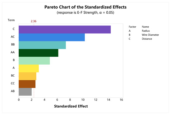 In this paper, a Central Composite Experimental Design (CCED) including three-time center point experiments was conducted to analyze the effects of the factors above. The generated randomized trial sequence table was as depicted in Table 3. In Table 3, StdOrder is the Standard Order of CCED which must run randomly. PtType is the Point Type of CCED, where means the center point of surface, 0 means the center point of body, and 1 means the vertex. All values of factors are shown in a digital format, where means a low level, 0 means a medium level, and 1 means a high level. A total of 17 simulation trials were conducted in accordance with the Run Order. The simulation results were assigned to their experimental groups, respectively, for factor analysis. To achieve a more accurate fit, a second-order model should be considered, which incorporates the interaction between the three factors and their squared term effects. Figure 12 shows the Pareto diagram of the influencing factors obtained by using Minitab software. From the diagram, the factors and interaction effects on the response are . The interaction effect between radius and wire diameter is insignificant and is removed in the subsequent analysis process.