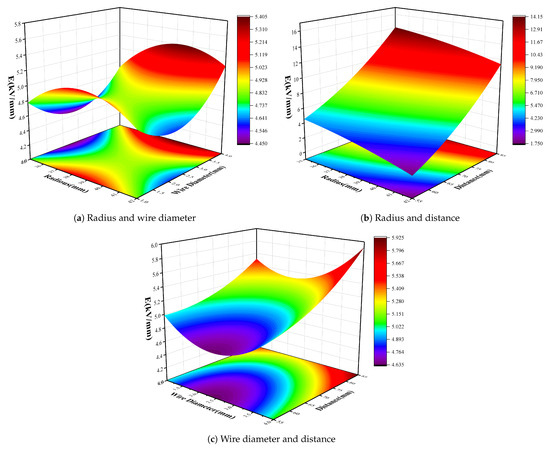 After removing the insignificant interaction effect, the model’s response surfaces were established, and are shown in Figure 13. The response surfaces between the parameters reveal that in the simple model, the interaction effect between some parameters is evident. For instance, in Figure 13a, the surface of radius and wire diameter interaction is ‘saddle-shaped’, indicating that the interaction effect is not prominent. In Figure 13b, the contour line of radius and distance interaction is ‘stepped’, indicating that the interaction effect has the most significant impact on the electric field. In Figure 13c, the contour line of the interaction of line diameter and distance is circular, suggesting that the interaction effect is significant.