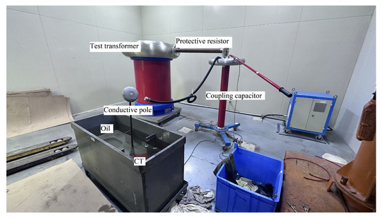 Figure 15 presents a schematic diagram of the primary side circuit, established according to the (PRC) National Standard of CT partial discharge test [25]. The circuit comprises the test transformer , the power-frequency test transformer , the protective resistor , the partial discharge measuring instrument , the detecting impedance , and the CT S that requires testing. The system generates a pulse current partial discharge signal, which is obtained through the coupling capacitor and directly sent to the local discharge measuring instrument. A photo of the test station is shown in Figure 16.