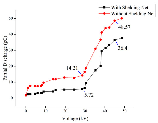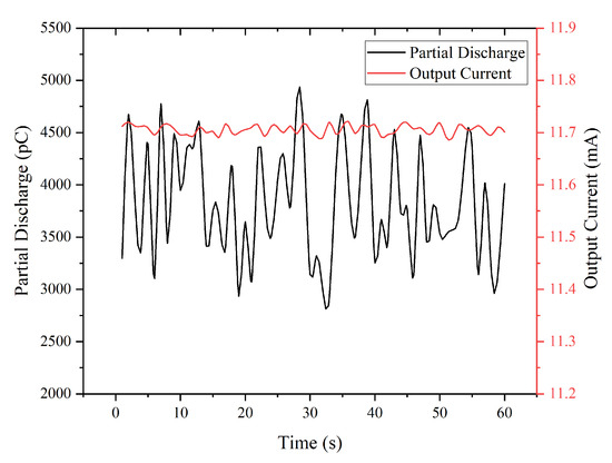The partial discharge meter measured a background signal of 1.70 pC after the conectining was completed without applying voltage. The partial discharge signal of the current transformer before and after improvement is shown in Figure 17. Before improvement, the meter measured 14.21 pC in the low-voltage state, 48.57 pC in the high-voltage state, and the comparison result was 5.72 pC at a low voltage and 36.4 pC at a high voltage, which was 60% lower after improvement. The optimization effect is obvious. The CT withstand voltage test at 62 kV showed an obvious discharge phenomenon without the addition of a shielding net. However, after optimization, it could withstand up to 85 kV in 1 min without any discharge. Figure 18 shows the power-frequency withstand voltage experiment data. When there is a discharge, the current signal significantly surges to zero.