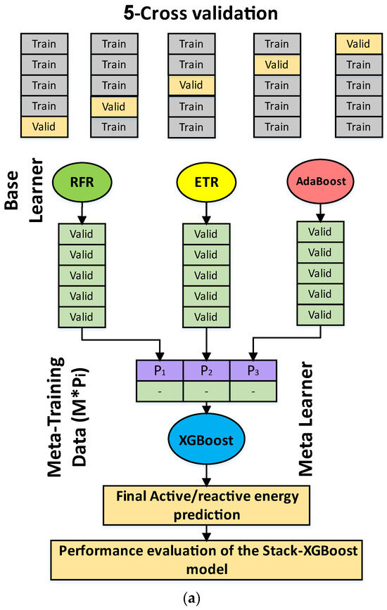 Stage 3: The initial tier of the Stack-XGBoost framework comprises the foundational models (XGBoost, AdaBoost, and RFR). These foundational models conduct predictions for the active/reactive energy consumption through a five-fold cross-validation approach. The default configuration settings of the XGBoost algorithm as implemented in the scikit-learn (sklearn) library have been employed in this study.