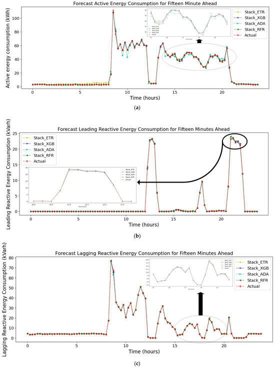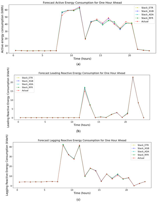 To elucidate, the Stack-XGBoost model has achieved remarkable results, as evidenced by its RMSE values of 0.69, 0.13, and 0.22 for active energy consumption, leading reactive energy, and lagging reactive energy, respectively. These outcomes demonstrate its superiority over the Stack-ETR, Stack-RFR, and Stack-AdaBoost models, except for the cases of and , where Stack-RFR achieved identical results. Specifically, the Stack-ETR, Stack-RFR, and Stack-AdaBoost models yielded RMSE values of 0.9, 0.16, and 0.27 for ; 0.88, 0.16, and 0.23 for ; and 0.81, 0.17, and 0.26 for , respectively. Furthermore, the proposed Stack-XGBoost model outperformed its counterparts in terms of MAE and MSE, showcasing values of 0.35 and 0.47 for active energy consumption, surpassing Stack-AdaBoost and Stack-RFR, which displayed MAE and MSE values of 0.36, 0.66 and 0.41, 1.29, respectively. In the case of , the proposed model achieved an MAE of 0.05 and an MSE of 0.02, emerging as the frontrunner among the proposed models. Moreover, for , the proposed Stack-XGBoost model demonstrated the lowest MAE and MSE values, with figures of 0.09 and 0.05, respectively.