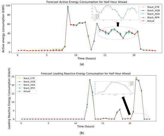 In the second scenario, the outcomes of the forecasting results for the active/reactive energy for a half hour ahead is presented. Overall, it is evident that the Stack-XGBoost model developed in this work demonstrated superior performance by achieving the most favorable results, as evidenced by the attainment of the lowest RMSE, MAE, and MSE values for the active energy and the lagging/leading reactive energy, as presented in the accompanying