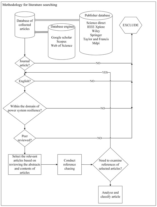 To explore the literature on review papers, the search strings “resilien*” and “power system*” and “review*”; “resilien*” and “power grid*” and “review*” and “resilien*” and “grid*” and “review*” were used.
