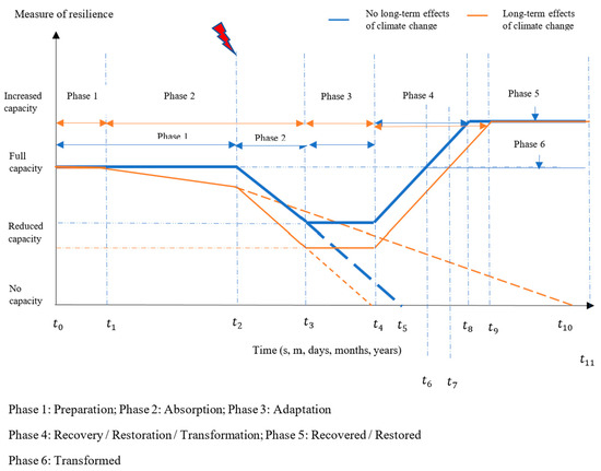 - Resilience planning must be undertaken before the systems start experiencing reduced functionality. The preparation stage in systems exposed to long-term effects of CC might be shorter () than the other systems ().