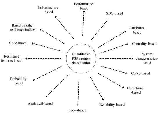 The words metrics, index, indicator, and functionality were used interchangeably [58]. Technically, a metric is a system or standard of measurement. An indicator is anything that indicates the state or level of something; it is a guide to a metric. The PSR metrics (PSRMs) are tools to measure (quantify/assess/evaluate/calculate/determine) the resilience level of a PS [58]. The proposed metric framework system, which classifies the PSRMs into performance- and non-performance-based, can be found in [58]. While PSRMs are generally categorised as either operational or infrastructural resilience [59], in [30], they are classified into four types: metrics based on resilience features, metrics based on reliability properties [16], code-based metrics [64], and other metrics. On the contrary, the authors of [42] generalised these metrics into either flow- or centrality-based metrics. Quantitative RMs have been classified according to attributes [29], and further categorised as: generic, transmission level, distribution level, stochastic, deterministic, cost-based, energy-based, time-based, planning, operational, static, dynamic, use of simulated, and real data metrics. The metrics are categorised as analytical, probabilistic, curve-based, and reliability-based [65]. PSRMs have also been classified based on performance and system characteristics [23]. Alternatively, these indicators have been categorised based on sustainable development goals (SDGs) [26]. These classifications are summarised in Figure 4. It was noted that this classification was based on quantitative RMs and therefore it was proposed that PSRMs be classified into qualitative and quantitative metrics to match the PSR evaluation classification.
