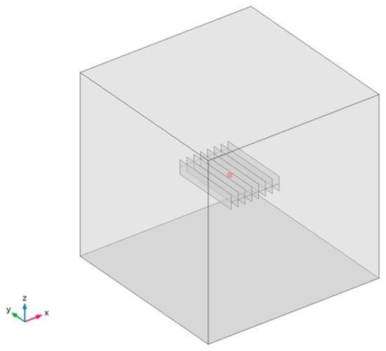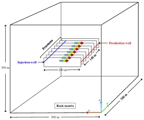 The main consideration when laying out wells is the fracture pattern, which is affected by the ground stress. When the minimum principal stress is horizontal, the fracture is vertical, with a length of 200 m, a height of 40 m, and a width of 0.01 m. The numerical model is set up with eight vertical fractures spaced 20 m apart in the center of the rock mass. Due to the uniform distribution of fractures in the simulated study area, this paper adopts the mining mode of one injection and one mining. Injection wells are set at 140 m long and 0.1 m in diameter. The well spacing is set at 200 m. Cold water is injected from the injection wells, flows through rocks and fractures to be heated, and is withdrawn from the production well. The geometric conceptual model is shown in Figure 2.
