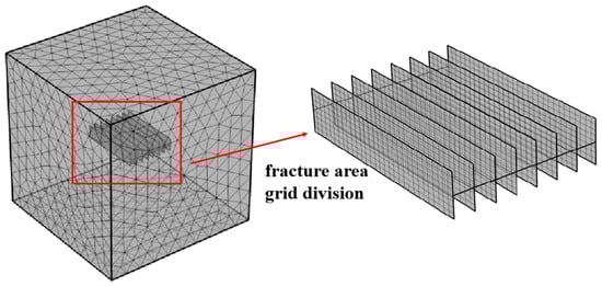 Mesh generation is an important part of the established physical model in the calculation process. The size and shape of the mesh have a direct impact on the calculation results. To reduce the influence of boundary effects in the finite element solution of numerical simulation software, the method of combining coarse and fine grids is adopted in the calculation, and the numerical simulation of the three-dimensional system of geothermal development in high-temperature rock mass is successfully realized. In principle, the denser the mesh, the higher the calculation accuracy, but the greater the workload and the amount of calculation. Considering the concentrated development area of fractures and the vicinity of injection–production wells as the key research areas, the calculation method of first coarse and then fine is adopted. That is, the whole geothermal system is calculated by using the coarse calculation model. Then the geothermal system near the injection–production wells and fracture areas is calculated using the fine calculation model. The value obtained by the coarse calculation method is used as the boundary condition of the partition calculation to reduce the influence of the boundary effect on the system []. According to the spatial structure characteristics of the simulated deep geothermal body geological model, the free triangular mesh is used for mesh generation, and the simulation mesh generation method and mesh generation density are determined. The mesh is refined in the injection–production well and the fracture development area. The complete mesh contains 84,307 domain units and 770 side units, as shown in Figure 3.