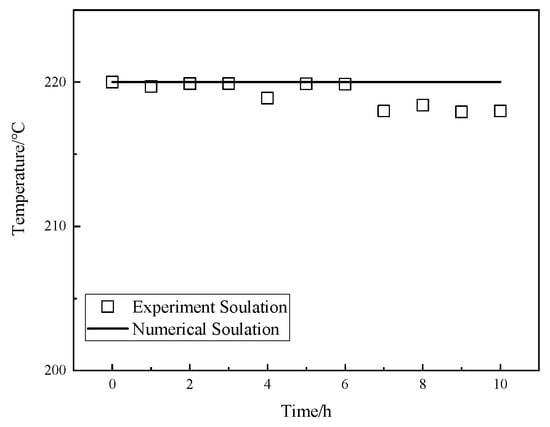 To verify the correctness of the THMC coupling model, this chapter establishes a horizontal well injection and extraction model that simulates 30 years of geothermal production, and the geometric model is shown in Figure 2. In this section, the feasibility and correctness of the above THMC coupling model are verified by simulating the temperature evolution experiment of rock samples during real-time high-temperature and high-pressure geothermal extraction experiments under THMC coupling. By simulating the construction conditions in the study area with a reservoir temperature of 220 °C and one injection and one extraction, the model parameters and engineering conditions are referenced in Table 1 and Table 2. Under the coupling effect, the temperature field, seepage field, stress field, and chemical field interact with each other. To highlight the influence of the temperature field on other fields, the model focuses on the influence of the variation of each parameter on the reservoir temperature and the system heat extraction efficiency. By comparing the experimental solution with the numerical solution in this study, the simulation results are in good agreement with the experimental solution, as shown in Figure 4. The correctness of the numerical solution in this study is proved.