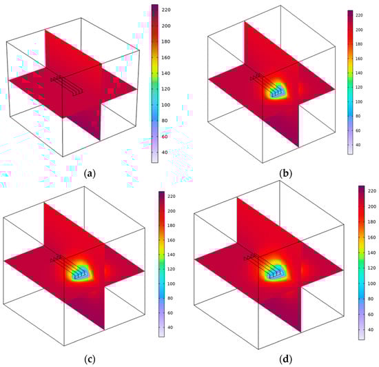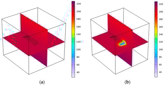 The initial reservoir temperature of the model is 220 °C; the upper and lower boundaries are regarded as the thermal insulation boundary; the surrounding boundary is the constant temperature boundary; and the initial injection temperature is set to 293.15 K (20 °C).