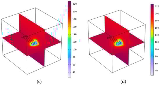 Temperature(°C) change in the reservoir when the heat extraction working fluid is water during mining. (a) The 0th year of mining; (b) the 10th year of mining; (c) the 20th year of mining; (d) the 30th year of mining.