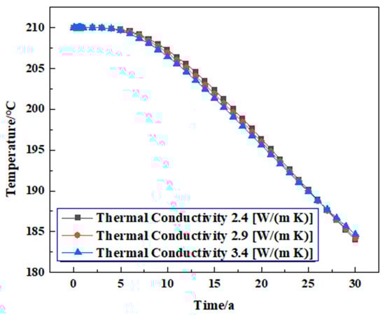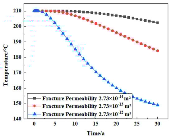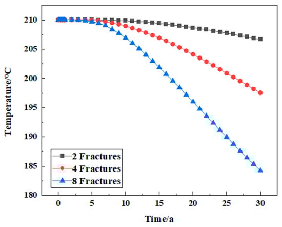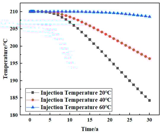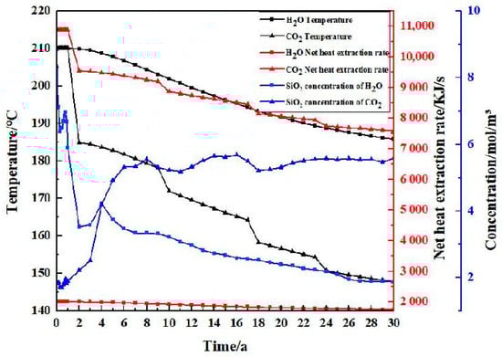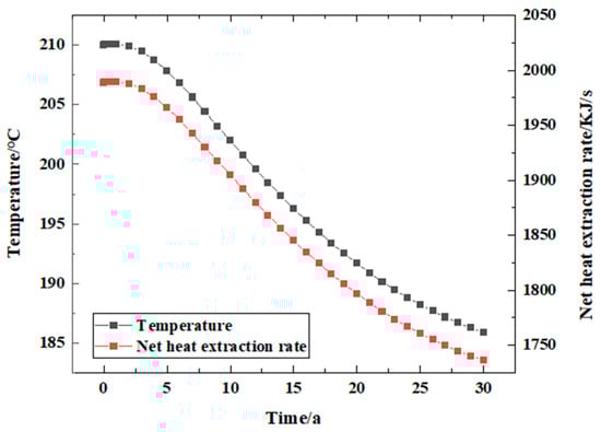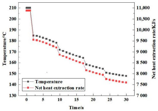 The reservoir temperature change and net heat recovery rate () when the injected working fluid is water during the 30 years of simulated geothermal mining are shown in Figure 6. In the process of numerical simulation, the reservoir temperature change shows a stable downward trend. The reservoir temperature begins to decrease from the initial reservoir temperature, and the cold water reaches the production well from the injection well through the fracture, resulting in a decrease in the temperature around the injection well. It can be seen from Figure 7 that in three decades, the stable stage from the beginning of the heat production lasted for about three years, during which the temperature was maintained at 210 °C, and the net heat recovery rate was maintained at 2007 KJ/s. The system began to decline in the third year, and the temperature decreased from 210 °C to 185.84 °C, which decreased by about 11.5%. The net heat recovery rate decreased from 2006.31 KJ/s to 1751.19 KJ/s, a decrease of about 12.72%.