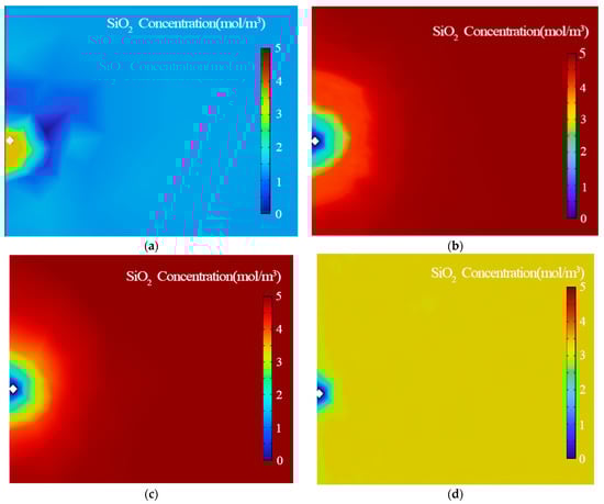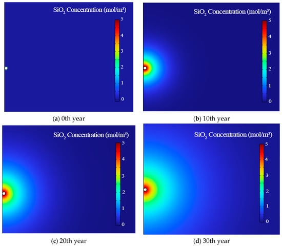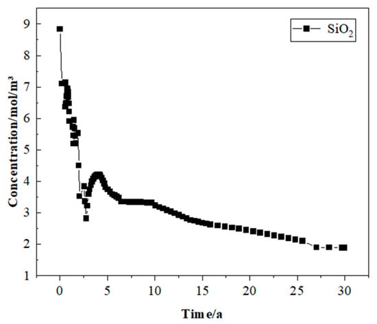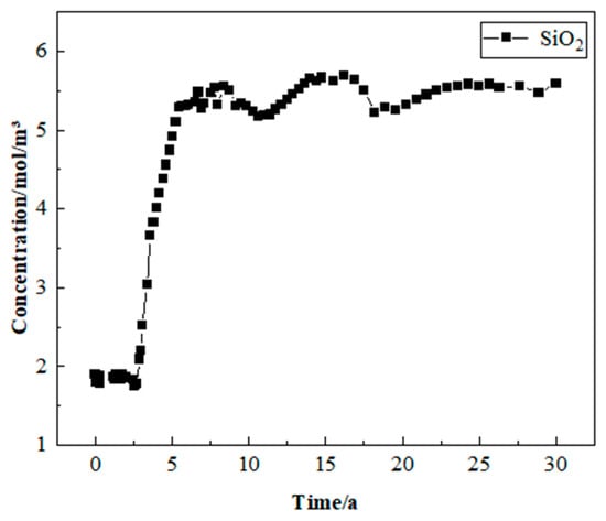 When the injection well injects a large amount of cold water through the fracture to heat the production well, the material reaction equation between the water and the granite is Formula (13). Assuming that the concentration of the reaction substance (quartz) is lower than that of the solvent liquid (water), the Fickian diffusion law can be used to describe the diffusion term in mass transport. Therefore, the convection–diffusion equation can be used to model the mass transfer of SiO2, H2O, and H4SiO4.