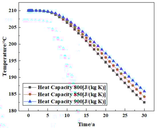 and are production and injection rate, respectively, kg/s; and are the enthalpy of production and the injection fluid, respectively, kJ/kg. The model sets the injection/production rate as 2.5 kg/s, and the enthalpy value () at each temperature () corresponding to the injection of water is calculated with Formula (20).
