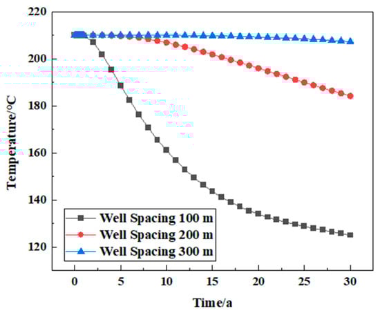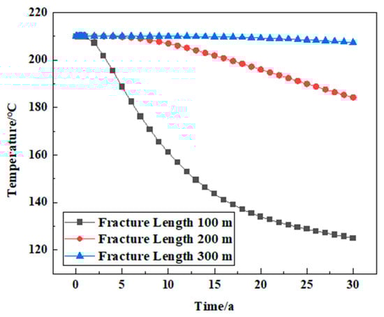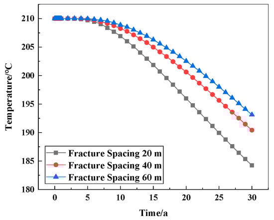 During the exploitation of geothermal systems, the injected low-temperature water continues to take away the heat of the rock fracture or pore surface, resulting in changes in the reservoir temperature field. Figure 5 shows the temperature changes of the thermal reservoir in 0, 10, 20, and 30 years, respectively, in which purple represents the low temperature and dark red represents the high temperature. As can be seen from Figure 5, in the 10th year of system production, the temperature of the rock mass closer to the fracture surface gradually decreased due to heat transfer, forming a low-temperature zone, with the effects of mining spreading as far as 88.72 m from the vertical distance of the injection well. In the 20th year of production, the reservoir temperature around the injection well is decreasing, and the influence of mining is farthest spread to the range of a 119.31 m vertical distance from the injection well. At this time, the rock mass temperature at the production well remained essentially unchanged, and the system can ensure continuous heat output. With the continuous increase in mining time (the 30th year), the low-temperature area of the reservoir is continuously expanded along the injection well to the periphery of the fracture with the influence of geothermal extraction, and the low-temperature area in the reservoir is also expanded and gradually extended to the production well, the farthest spread to the range of a 130.45 m vertical distance from the injection well.