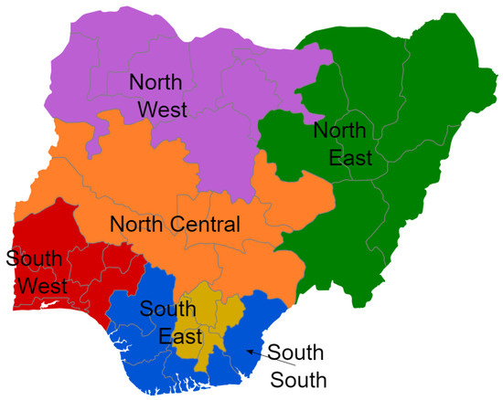 In a bid to develop reliable and useful data, the selected locations in this work are widely dispersed, covering the six geopolitical zones in Nigeria, as illustrated in Figure 1. Table 1 presents a general overview of the geographical information about the PHC’s location. This approach will give a broader insight into how system configurations and optimal solutions for HRES are affected by the locations and their performance in separate regions of Nigeria. In order to explicate and fully grasp how and why the separate regions will have entirely different configurations irrespective of their separate load profiles, information about the meteorological data is presented in this section [9]. While the North-west (NW) and North-east (NE) zones have a hot, semi-arid climate type, the North-central (NC) region is tropical. Tropical and dry regions are associated with high temperatures. These differences, among others, alter the design parameters in determining the optimum solutions for these areas.
