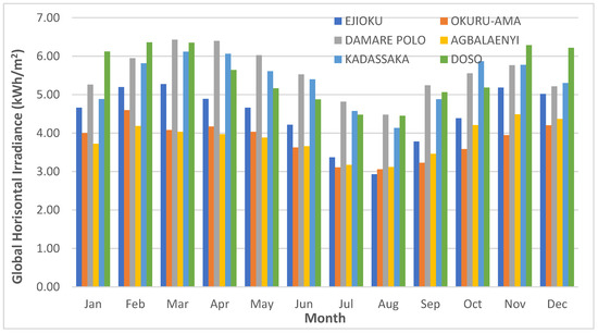 A pictorial comparative analysis of the GHI of each location is shown in Figure 2. The inputs are the average monthly GHI from 5 to 16 years. It is observed that Doso and Damare-polo, which are, respectively, located in the tropical and hot–semi-arid regional parts of Nigeria, have the highest solar penetration. However, the stations located in the southern part, which include Okuru-ama, Ejioku, and Agbalaenyi, exhibit lower solar potential.