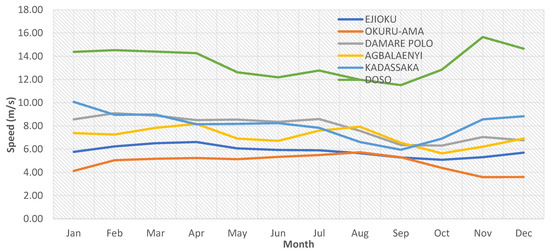A comparative analysis of wind speed is presented in Figure 3. From this figure, the data show that the Northern region locations, Doso (Northcentral), Kadassaka (Northwest), and Damare-polo (Northeast), have the highest wind penetration level, followed by Agbalaenyi (Southsouth), with the lowest potential stations at Ejioku (Southwest) and Okuru-ama (Southeast); Doso has the highest level overall. Additionally, it can be observed that there is a relative drop in wind speed in centres starting from May to September, after which there is an observed rise in relative wind speed.